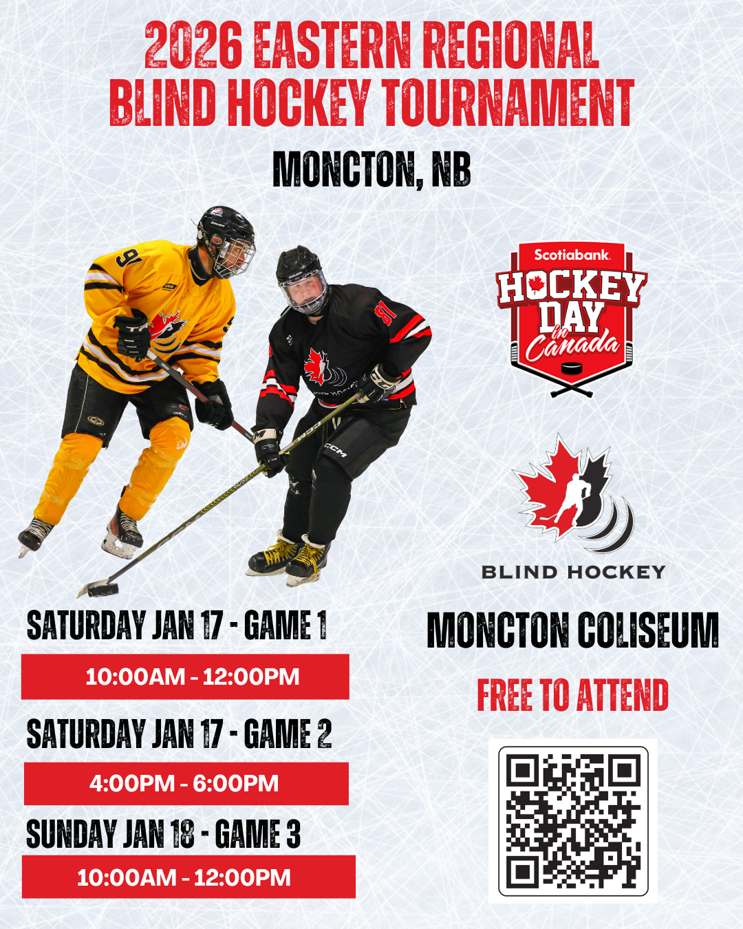 Canadian Blind Hockey is thrilled to announce that the 2026 Eastern Regional Blind Hockey Tournament presented by the CNIB Foundation will take place as part of this season’s Hockey Day in Canada celebrations in Moncton. This will be the first-ever Blind Hockey tournament in the province of New Brunswick and will take place at the Moncton Coliseum from January 16 – 18th, 2026.